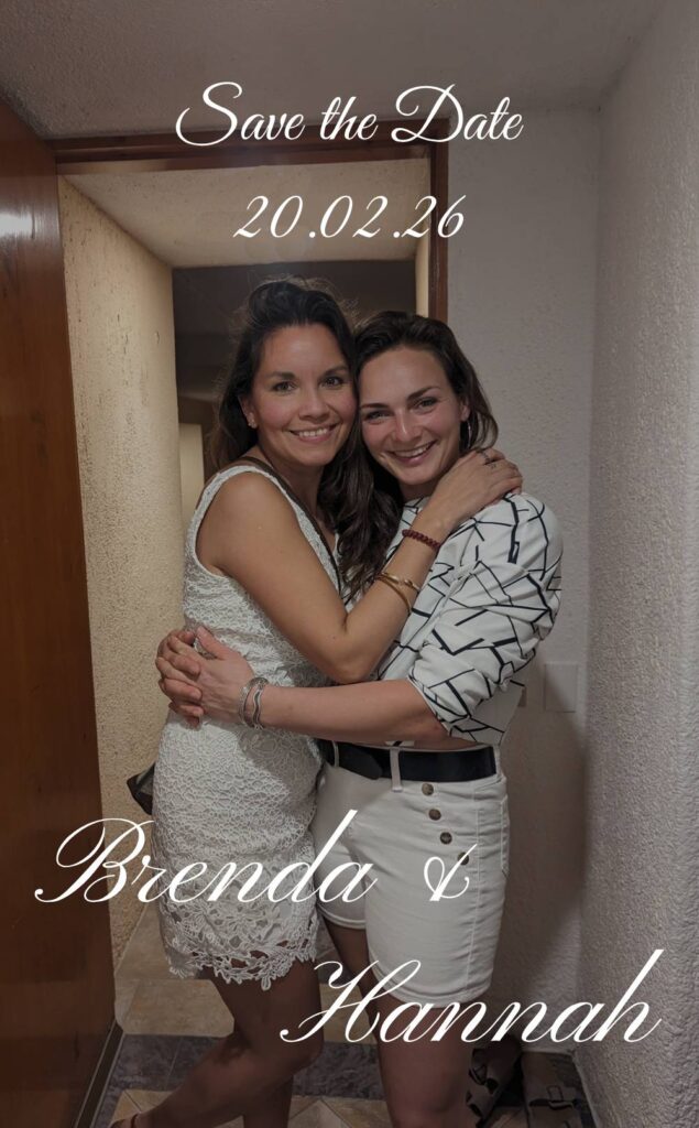 Brenda sorprendió a Hannah con el anillo de compromiso organizando una búsqueda del tesoro el Día de Reyes, el 5 de enero de 2025. Después de diez minutos de lágrimas, abrazos y muchos besos (¡literal!), Hannah dijo que sí, en la cima de Okanagan Mountain, con una vista invernal espectacular.
