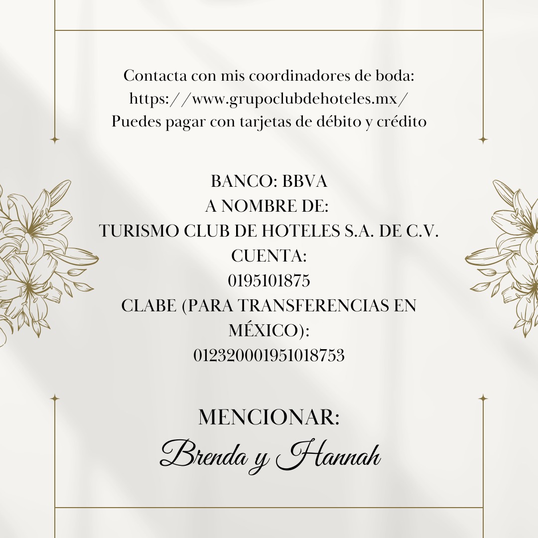 *Es importante que sepas que somos el único medio para reservar tu habitación para entrar al evento ya que si lo haces por otro conducto aunque te hospedes en el mismo hotel, se te cobrará el acceso a la boda, gracias por acompañarnos!